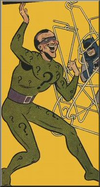 Nygma took on two women as his crew, and called them Query and Echo. They did much of the heavy lifting, allowing Riddler to scheme. His trademark was to leave behind a clue at his crimes, or to send one out in advance of them, to challenge the police to catch him. The crimes eventually drew the attention of Batman, who solved the crimes and brought Riddler in.