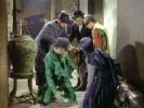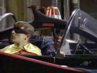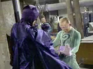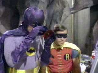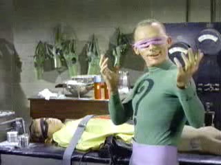 At The Republic Of Moldavia in The Gotham City World's Fair, The Riddler's scheme to use the law against The Batman is already taking shape, as the Moldavian prime minister slices into the Moldavian Friendship cake and unknowingly triggers a hidden bomb inside, releasing a concealed Riddle. This Riddle leads The Dynamic Duo to The Peale Art Gallery, where they catch The Prince Of Puzzlers in the act taking a cross from its proprietor, Gideon Peale, at gunpoint. They stop him with an explosive, but learn to their horror that Riddler's gun was actually a lighter, and the cross was his to begin with. Riddler whistles, and some lawyers arrive bearing subpoenas, which The King Of Conundrums is only too pleased to hand to The Caped Crusader. Batman is slated to be sued for false arrest! The Dynamic Duo must uncover The Riddler's plot before the case comes to trial, or Batman will be forced to reveal his true identity in court, completely destroying his value as an ace crimefighter and stunting his career forever. 2 cleverly hidden Riddles in the legal documents lead Batman and Robin to the new What A Way To Go-Go! discotheque; there, The Prince Of Puzzlers rejoins his gang, The Mole Hill Mob, and informs them that Batman has had time to solve his clue. As The Riddler and The Mole Hill Mob make their way through an underground corridor to the discotheque, his plan is once again put into action. Being a minor, Robin The Boy Wonder is legally forbidden to enter the disco, so he waits outside in The Batmobile and monitor The Batman on the Batscope, as he enters alone. While The Batman dances The Batusi with The Riddler's assistant Molly, he suddenly falls victim to drugged orange juice he unwittingly ingests; watching on The Batscope, Robin attempts to race into action, but falls victim to The Riddler's tranquilizer dart gun. Riddler tries to steal The Batmobile but accidentally triggers its antitheft rockets; he then tries to destroy the car, but the flames are extinguished by its Batostat Antifire Activator! Robin is carried away down a manhole by The Riddler and The Mole Hill Mob, while Batman finds himself in no condition to pursue them, and is forced to surrender his Batkeys to the police. And at the most inopportune time, too: The Batsignal flashes from the roof of GCPD. The policemen vow not to tell the Commissioner of Batman's drunken state. Meanwhile, in The Riddler's hideout, Robin is being strapped to a table as The Count Of Conundrums, surrounded by Molly and The Mole Hill Mob, attempts to operate on the unconscious boy!!