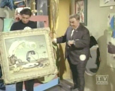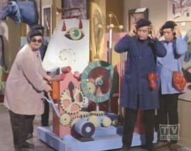 The master of time crimes, Temple Fugate, The Clock King, arranges for one of his trick timepieces to be sold to the Harry Hummert Jewelry Shop, which caters to Gotham City's elite. Concealed inside the clock is a small TV camera which allows Clock King to observe everyone in the shop. Alerting his moll, Millie Second, and his group of Second Hands, he activates the tricky mechanism in the clock, which gasses all of the patrons asleep. CK and his minute minions see this as a golden opportunity to strip the shop clean of its valuables. Batman and Robin are alerted to the robbery by Commissioner Gordon and rush to Hummert's shop, where they discover that the clock was bought at The Parkhurst Gallery. They quickly leave the shop and speed for the gallery, where they discover that the clock was put up for auction by a Mr. Kronos. The Dynamic Duo deduce that it was Temple Fugate incognito, and they make their next stop Dunbar's Drive-in in search for one of Fugate's former molls, Thelma Thymepiece. Meanwhile, back at The Parkhurst Gallery, Clock King disguises himself as pop art expert Progress Pigment, and attempts to snatch a rare time-related painting under the very noses of the TV audience. After making a short speech to the crowd Temple "Progress Pigment" Fugate unveils his latest sculpture, called Time Out Of Joint, which resembles the inside of a clock and when turned on emits a potpourri of assembled sounds and noises as the mechanical parts move about. Nobody suspects that the mechanical marvel is actually being used as a decoy to cover up the sound of a saber saw attatched to its rear, which cuts through the wall into the storage room filled with valuable paintings.