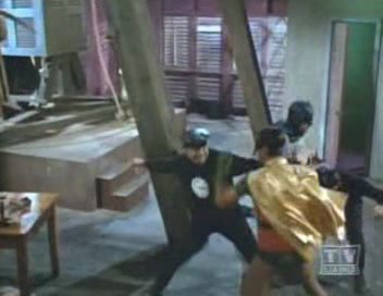 After the saw does its diabolical duty, "Progress Pigment" clicks another switch on the sculpture, this one emitting a high-pitched noise so piercing that it knocks everyone out except for him and his Second Hands, 3 and 5, who were protected by earmuffs. Clock King enters the storage room and swipes the clock masterpiece therein. Batman and Robin, who, at Dunbar's Drive-in, have been enjoying their Batburgers and watching The Clock King on The Batscope in The Batmobile, rush for the place and confront CK and his Second Hands as they depart with the painting. They proceed to thrash Second Hands 3 and 5 but are stopped by Clock King, who fakes a sprained wrist sustained from clutching the heavy painting and releases a barrage of giant springs in their direction from yet another hidden compartment in his Time Out Of Joint. The time The Dynamic Duo make in trying to pry themselves free of the giant coils gives The Clock King and The Second Hands room to split. The Caped Crusader and The Boy Wonder analyze the dust inside a wristwatch dropped by Clock King at the gallery, and use it to trace him and his gang to their hideout at the deserted premises of Tick Tock Synthetic Rubies, Inc. Unaware that CK deliberately left behind the watch, The Duo fall into an untimely trap! The Clock King remove their utility belts and encase them in the lower chamber of a gigantic hourglass and leave them to be buried under sand which slowly fills it up and threatens to smother them to death!