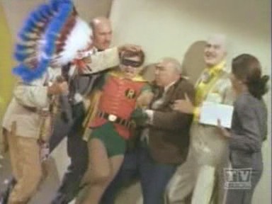 In an attempt to take over Gotham City, Egghead pilfers the city charter from its case at City Hall. It seema the city is actually owned by The Mohican Indians and is leased to the city governmant! Every 5 years, the city must pay The Indians - in this case Chief Screaming Chicken, last of The Mohicans - 9 raccoon pelts; 3 pelts from each of the 9 descendants of Gotham City's founders: Pete Savage, Tim Tyler, and our own philanthropist Bruce N. Wayne. If the pelts aren't delivered by midnight on the night of the lease's expiration, the full force of Gotham City will revert back to The Mohicans. Egghead secretly signs a lease with The Chief to act as his legal representative if and when the time on the lease runs out, which Egghead intends to make sure will happen. Batman and Robin trace Egghead to his hideout at The Ghoti-Oeufs Caviar Company and cartch him in the act of negotiating with Screaming Chicken. Egghead bombs The Duo with an egg containing nitrous oxide, and beats a hasty exit with his gang; Batman and Robin later neutralize the gas's aftereffects with Sad Pills.