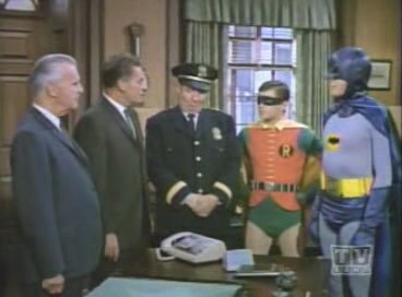 Just as the machine has reached full power and is beginning to tap into the secrets of Bruce's mind, Dick reaches the machine's powerswitch and raises it from 110 to 220 currents, causing the machine to overload and explode. Egghead is thus forced to fall back on "Plan B": a radar egg which he activates and then takes off. The millionaires use and overhead water pipe to escape the deadly egg, and Bruce takes a grape and, treating it as if it were a marble, flicks it at the bomb, detonating it. The four head back to the city, where they discover they have missed the deadline by 3 minutes. Gotham City is now in the posession of Chief Screaming Chicken and Egghead. Egghead immediately fires all of the city officials, banishes The Dynamic Duo from the city, and then declares the city open season for the criminal underworld.