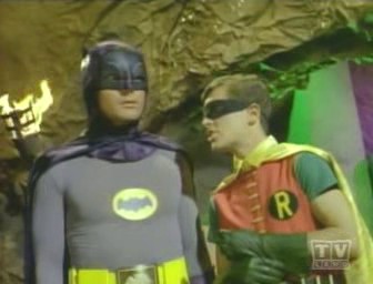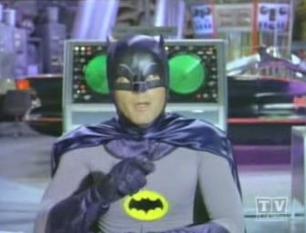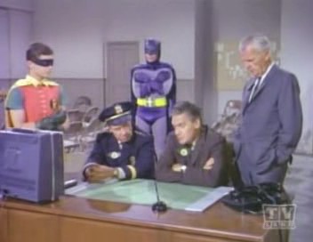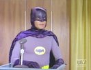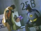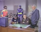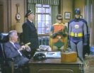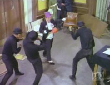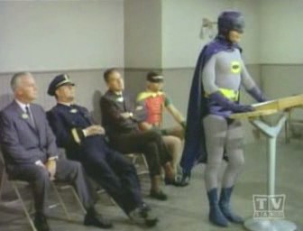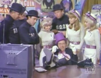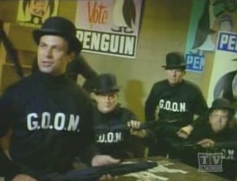 With the trusty aid of his acid-proofed Batcostume prepped by Alfred, The Caped Crusader leaps off the scale and into the acid, protecting his exposed face with his cape. He quickly climbs out of the vat, dips his hands into the acid to dissolve his bonds, and frees Robin. Later, Batman appears in a televised debate with The Penguin, in which Penguin states that Batman associates with criminals, while he labels himself as an "associate with the law," despite his claim of "no mudslinging in this campaign" . The debate is interrupted by news of The GOONs' breaking into The Gotham City Convention Hall and making off with the priceless collection of gems set up for display at an upcoming jeweler's convention. The Penguin and The Dynamic Duo rush off to thwart the crooks.