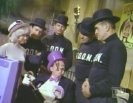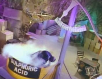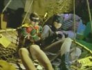 While The Caped Crusader launces a rather tasteful, low-profile campaign, The Penguin proceeds in the opposite direction, going all out in overshadowing Batman with loud bands, a belly dancer, pretty girls, and free champagne! Later, when Batman and robin sre scheduled to appear before the Grand Order Of Occidental Nighthawks (G-O-O-N!), they wind up confronting Penguin's G.O.O.N's, instead. The Dynamic Duo are quicky overpowered, bound and tied, and finally suspended on one side of a giant scale (emulating The Scales Of Justice!) over a scalding vat of sulphuric acid! The other side of the scale is filled with blocks of ice suspended over a giant heater; as the ice melts, The Duo comes closer and closer to the acid bath!