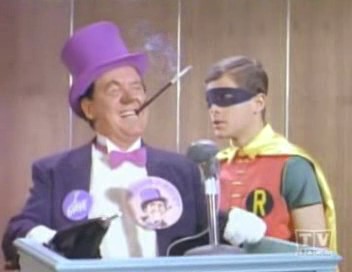 After a heated fight, Penguin emerges victorious, giving him a wide lead over his caped opponent in the subsequent polls, but the final election results show an increase of support for Batman. The Penguin realizes his political career is becoming kaput, thus forcing him to kidnap members of the election board on in an elaborate attempt to sway the votes in his favor. The Dynamic Duo trace The Penguin to his hideout. There, they rescue the election board and package the Penguin along with his lackeys inside Penguin's own campaign literature machine. The Duo then tell Penguin that Batman won the election by an overwhelming margin, for the votes were already counted when he kidnapped the board of election members. Returning to police H.Q., The Caped Crusader turns down his new position in Mayor Lindseed's favor. Over the phone, Batman also talks to the two major political parties in the United States. Both offer him the 1968 nomination for President of the United States. The first offer he declines. The second offer he responds by saying he thought the party already had a canidate.