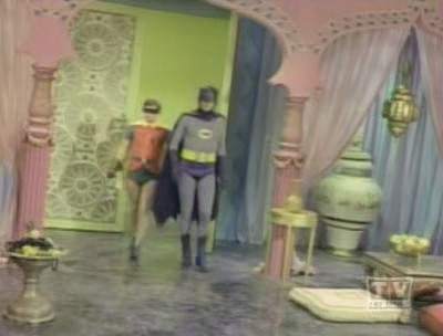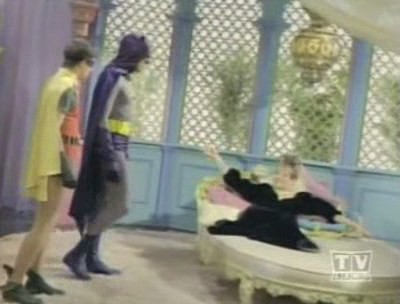 The Dynamic Duo speed to Marsha's love-nest/hideout, where the criminal Queen Of Diamonds shoots a love-potion-tipped arrow at Batman, but The Caped Crusader uses every fiber of his superior Bat-will to fight off the powerful drug. Enraged by this insufferable effrontery, Marsha orders The Grand Mogul her Guardians to destroy Batman and Robin and in the fray, Robin is both drugged and captured. Marsha offers to trade the Boy Wonder for huge batdiamond that powers The Batcomputer in The Batcave. Batman demurs, saying that no stranger can enter the Batcave; Marsha bounds over this hurdle by offering Batman her hand in marriage. This way, she will no longer be a stranger, she will become Mrs. Batman! The next time we see Batman, he walks down the aisle with Marsha toward the church altar!