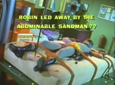 Sandman's scheme is a success, and he is summoned to Spaghetti's penthouse; there, while examining her eyes, he gasses her asleep. Working fast, he snaps photos of J. Pauline's financial ledger just as The Dynamic Duo arrive to rescue her from the man they--but not J. Pauline!--believe to be The Sandman. While Spaghetti proves to them that she wasn't in danger, Sandman escapes. The Caped Crusader and The Boy Wonder later trace The Sandman to his GHQ at the abandoned Morpheus Mattress Factory on Derwin Alley. Upon entering the deserted factory, they are quickly seized by Sandman and his henchmen Snooze and Nap. The Batman is bound to a mattress under a giant button stitcher, while Robin is ordered to push the button which activates the machine. The Sandman decides to give Robin to Catwoman as a present and splits.