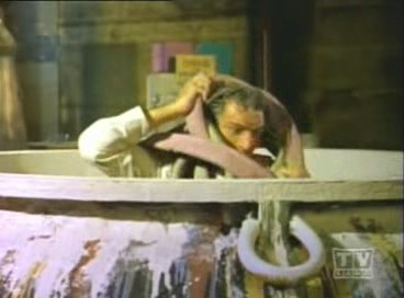 As the giant needle does its deadly duty, and beckons ever closer to The Caped Crusader, he removes his utility belt, and uses it to hook it onto the machine's control switch and shut it off in time. Meanwhile, Robin, having been delivered to The Catwoman by The Sandman, is forced at gunpoint into her tricky electrifying maze. Abandoning the purloined Batmobile, The Sandman prepares to doublecross The Catwoman and elope with J. Pauline Spaghetti and her millions. Returning to The Batcave, The Batman locates his missing Batmobile with The Batmobile Tracking Map and, with Alfred's able assistance, recovers it, but with no trace of The Boy Wonder. Moments later, The Commissioner phones and informs The Darknight Detective that J. Pauline has withdrawn $200 million from the bank and has eloped with Sandman to J. Pauline Spaghetti Island.