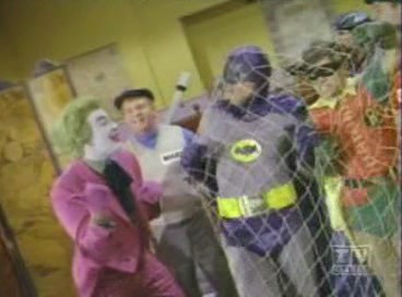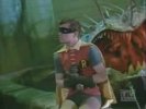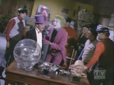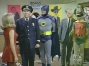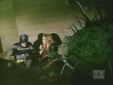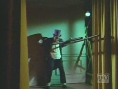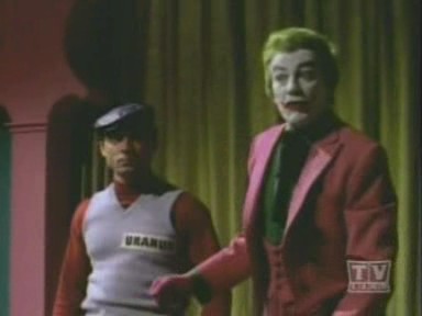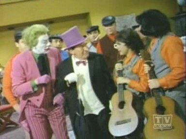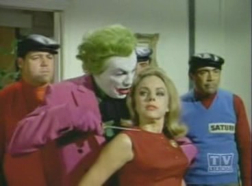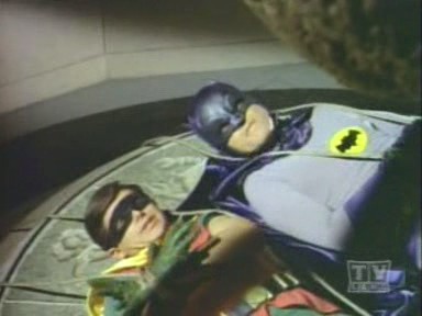 Arriving at the studio, The Caped Crusader and The Boy Wonder are led outside, where Penguin escapes on Joker's Boom Bug. Racing to The Batmobile, The Dynamic Duo chase the bizarre truck, but lose The Penguin, who cleverly lifts himself off with the aid of his trusty bumbershoot and an overhead wire. While Batman and Robin are led astray, The Joker and his shapely aide, Venus, make off with the true twins: the famous Twin Diamonds! Returning to The Batcave, The Caped Crusader learns the location of The Joker's hideout by analyzing the long wig left behind by Venus at the studio when she masqueraded as one of The Twins. Arriving at the hideout, Batman and Robin find the place deserted save for Venus, who falls for Batman and agrees to help him and Robin snare The Joker. She leads The Dynamic Duo to the opera house, where The Dastardly Duo, Joker and Penguin, plans to commit 2 Zodiac Crimes: the kidnapping of Leo Crustash (Leo The Lion and Crustacean The Crab!!). A fight ensues, but Joker and his minions escape, abandoning Penguin to the fate of the authorities. Figuring that The Homicidal Harlequin is scheming to pilfer a masterpiece entitled Virgin Bereaved (Virgo The Virgin!), Batman and Robin dash to The Gotham City Museum, where they are overpowered and tied down to an altar beneath a giant meteorite, which is rigged to fall on them (and turn them into tomato paste!) when its supporting cable is severed by a revolving piece of thermite attached to a planetary mobile surrounding the great rock!