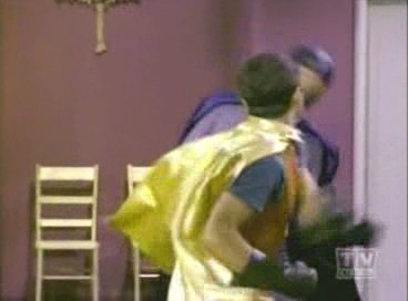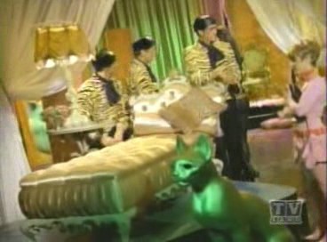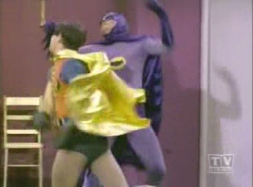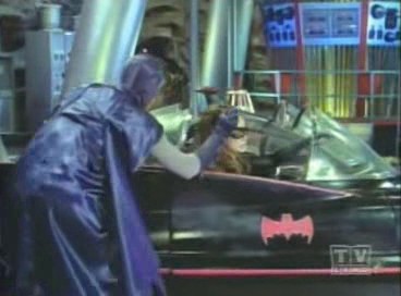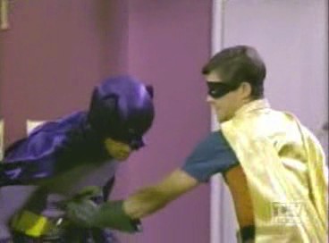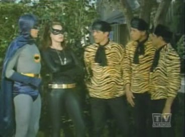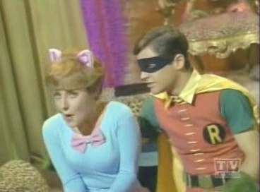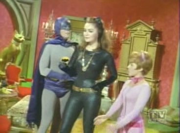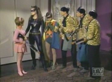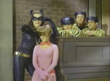 After Catwoman succeeds in perpetrating two more heists, Batman divines that her next job will be at Prince Ibn Kereb of Gedalia's weighing-in ceremony, where the Prince equals his weight in greenbacks. Batman arrived to do battle with Catmen Spade, Marlowe and Templar, but he finds that he must now deal with the drugged Robin, whom Catwoman sics on "the blue dragon". Batman allows the boy to rough him up and crash a chair over him. When the Caped Crusader tails the gang to Catlair West, and finds Robin all tied up, he thinks he has played possum and rushes over to free him, but when he does, he finds that Robin has played possum...just not in the way that Batman believes, though, and he is caught in a Cattrap. Batman finds himself dangling mere feet above certain death, tied to a giant mousetrap that will spring shut just as soon as The Boy Wonder finishes sawing away at the rope...