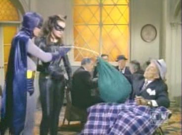 Returning to Gotham, Batman and Catwoman meet the rest of the gang at The Mint. Using a hidden entrance detailed in The Catwoman's plans, they enter the building with plans to loot the whole safe! They blast their way into the vault with a silent explosive, where they are confronted by Robin, now restored to his faithful crimefighting old self again thanks to The Batantidote. The Dynamic Duo make mincemeat of The Catmen, but, just as the police arrive to collect the crooks, Catwoman steals Batman's keys and escapes in The Batmobile. Commandeering O'Hara's squad car, The Dynamic Duo give chase through The New Guernsey Bridge, but realize the impossibility of gaining The Batmobile's top speed, so they use The Batmobile's remote control to stop the car at a waterfront building. The Catwoman takes chase by Batman and climbs to the roof to avoid capture, but she is overcome by vertigo! Here she proposes marriage to The Caped Crusader, which he rejects only when she suggests killing Robin to make their lives together purrfect. Pretending to surrender, The Catwoman reaches out for Batman's hand and deliberately slips, falls and disappears into the water below...but has she drowned?