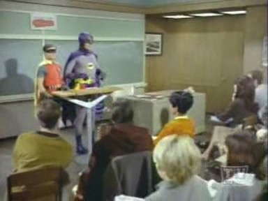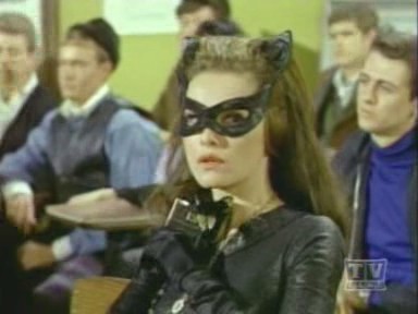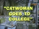 The Catwoman leaves jail and is turned over to her parole officer - Bruce Wayne. She immediately enrolls as a criminology major at Gotham City University. Aided by 3 overage freshmen named Brown, Cornell, and Penn, she arranges for the lifesized statue of Batman to be stolen from the university rotunda. Alerted by Gordon to the theft of the statue, The Dynamic Duo arrive on the scene. While The Caped Crusader examines the only clue to the theft, a freshman beanie containing a single red hair, The Catwoman uses the stolen statue as the model for a Batman costume for Cornell, who so costumed is an exact double for The Caped Crusader. The next day, Batman gives a lecture in criminology to Catwoman's class, where he gives a complete description of the statue thief. Believing Batman is on to him, Penn makes his escape as Catwoman secretly rings the class bell.