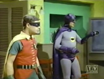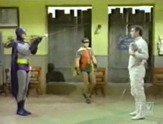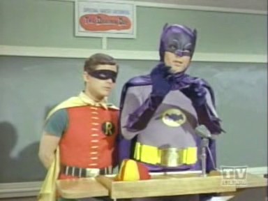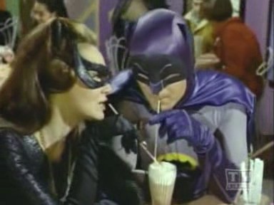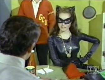 Later, when The Batman and The Catwoman are sharing a soda at The Sweet Shoppe, a local school hangout, Robin The Boy Wonder informs The Caped Crusader about the recent robbery of a supermarket by a crook wearing a Batman suit. Before he can investigate, Captain Courageous, a newly arrived police officer from California has him arrested. While Batman waits in jail, Catwoman incites a student riot. Alfred, disguised as Batman's lawyer, arrives at the Gotham jail with a Batmakeup case, and, after a quick switch, Batman leaves the jail disguised as Alfred. That night at a rally in Chime Square, The Felonious Feline captures The Caped Crusader and The Boy Wonder, deposits them inside a giant coffee cup, and activates the mechanical percolator that, in a matter of moments, will liquidate our heroes with deadly sulphuric acid!