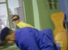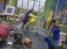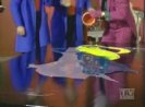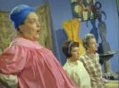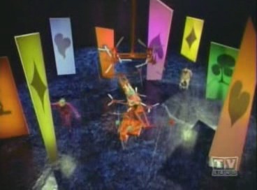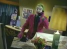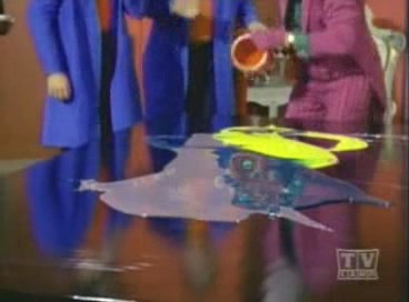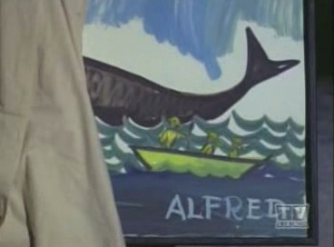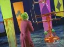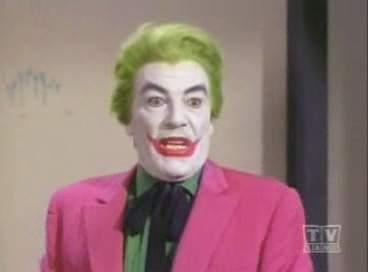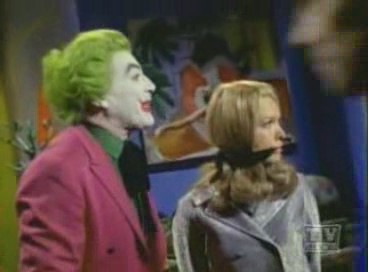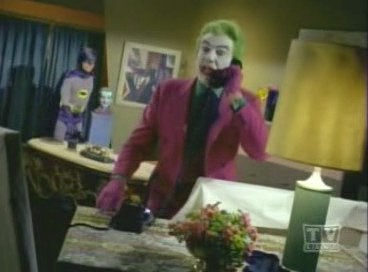 As the future seems bleak for our beloved Boy Wonder, Bruce blocks the mechanical works of the mobile with himself and his chair, long enough for Robin to work himself loose and use one of the flailing knives to deactivate the mechanism. Returning to see if the mobile has completed its diabolical duty, The Joker and his crooked cronies are jumped on by Bruce and The Boy Wonder. While they pin the henchmen to a wall with carefully thrown pallette knives, Joker begs for Baby Jane's forgiveness; feeling sorry for him, B.J. arranges for his freedom. She then takes him back home with her, where, during a chicken dinner, Joker covers her antique table with paint and has his henchmen chop it up. He convinces the gullible B.J. that he has turned her table into a work of art, and she lets him replace the priceless Renaissance art collection in her father's wing at the museum with the table's painted remains.