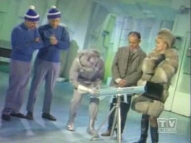 That night at the ice show, Bruce and Aunt Harriet pay a visit on Glacia in her dressing room...unwittingly interrupting her while she is attempting to keep in contact with Mr. Freeze through her compact which doubles as a 2-way radio communicator. Intrigued by her compact Harriet opens it and is surprised to hear the voice of Mr. Freeze! Glacia quickly covers up by calling it a music box, but Bruce Wayne/Batman is convinved well beyond the shadow of a doubt that Glacia Glaze---b.k.a. Emma Strunk---is definitely in league with The Frozen Fiend! Later that same night, Bruce Wayne does videorecord his TV message @ 11 P.M., so he, as Batman, can trap Mr. Freeze with Robin a good hour later when he tries to collect the ransom money. Meanwhile, Mr. Freeze has attempted to get Prof. Isaacson to spill the beans on his secret invention by putting him in a quick-freezer...without luck, however, for the Icelandic Isaacson is used to the intense cold weather, and it has little effect on him. A discouraged but undaunted Freeze then falls back on "Plan B," injecting Isaacson with carbon monoxide. After returning him to the quick-freezer, Freeze is surprised of The Dynamic Duo's appearance during Bruce Wayne's prerecorded telecast. He is enraged on learning they have brought fake money, and he had his men Frosty and Chilblains toss them into his sinister Sub-Zero Temperature Vaporizing Cabinet, which when activated will instantly vaporize their bodies and make them a part of the ice-skating rink above!