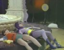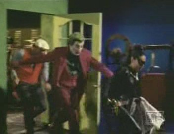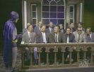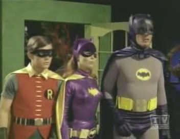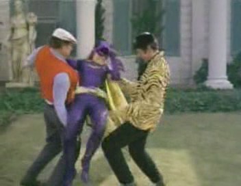 Barbara solves the riddle and goes to her father's office at Police HQ to call Batman (via The Batphone!!!) and arrange to rendezvous with The Dynamic Duo at the home of Little Louie Groovy, who owns the parchment's first clue: a nightshirt. The Batman and Robin arrive just as The Catwoman and The Joker arrive to steal the nightshirt. Joker tricks The Duo into shaking hands and buzzes them with his deadly Joker buzzer, and he and Catwoman leaves with the shirt. Batgirl appears moments later to revive batman and robin, and informs them that the shirt was only half the clue to the gunpowder's location, and The Dynamic Trio speed for the home of mod clothier Karnaby Katz, who owns the clue' second half in the form of a crib. However, The Trio arrive too late - or so it seems! Just outside the bushes Joker, Catwoman and their men wait in ambush for them!