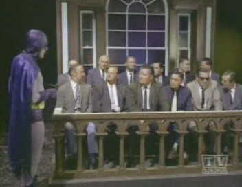 Without thinking the Joker lights a match so he can examine the gunpowder more closely, and as Batman wrestles the match away from him, it is unwittingly tossed into the gunpowder and sets it off! Batman quickly protects everyone with Antiblast Batpowder, and as The Trio prepares to deliver the criminals to the pokey, The Catwoman demands legal aid: Lucky Pierre, who has never lost a case (Holy Perry Mason!). Later, in court, Pierre refuses to crossexamine any of Batman's witnesses, despite the latter acting as prosecutor. Unknown to The Caped Crusader, the entire jury has secretly been replaced with Catwoman's former henchmen, who issue a dishonest not-guilty verdict! (Holy Fixed Jury!) Unfortunately, the jury foreman loses his disguise at the end of the trial, and, after Batman recognizes him, pulls a machine gun! Batman quickly disarms the gunsel, The Joker and his men rise to battle, and the crooks are rounded up. Lucky Pierre finally loses his first case, and he angrily discards all of his lucky charms and storms out.