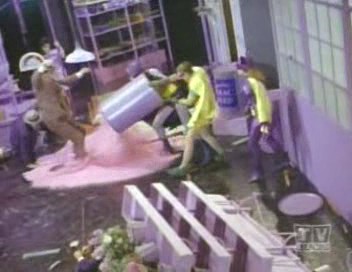 Batgirl and several of Gotham's Finest arrive at the factory at the same time, and while The Commissioner uses a bull horn to contact Louie, Batgirl sneaks into the factory...only to be immediately captured and dumped into a vat which Louie orders filled with hot oil used to extract the scent from the blossoms! Continually refusing to operate on the animals, Bruce finds himself forced to do so in order to spare Batgirl's life. Louie agrees and provides Bruce and Dick 2 glasses of warm water they request for this procedure, then locks the pair in the basement with the animals...but, of course, reneges on his promise and decides to 86 The Caped Crusadress anyway! While in the basement, Bruce introduces his latest Batinvention: The Instant Unfolding Batcostumes With Utility Belts; just add warm water, and they exxpand to full size! Minutes after, Brucer and Dick switch garb, and, as The Caped Crusader and The Boy Wonder, escape from the basement and rendezvous with the police, who aid them in breaking down the entrance in time to rescue a now out-of-vat Batgirl from Louie, and The Dynamic Trio rout the whole gang! Batman and Robin then pretend to rescue the kidnapped millionaire and his youthful ward by entering the basement and reemerge from within as Bruce and Dick.