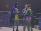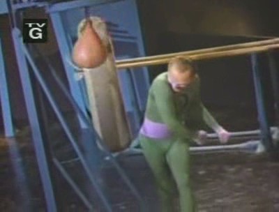 The Riddler attempts to take control of prize fighting in Gotham, kidnapping the current champ, Kid Gulliver, and brainwashing him into throwing his next fight. While Bruce, chairman of The Gotham City Boxing Commission, watches on TV, The Riddler robs reciepts from The Gotham Square Garden boxoffice, and leaves behind a blinking metal box, which puts the cashier in a state of shock! Examining the box Batman finds it contains a Riddle about a long-buried temple in Southwestern Asia. Later, Riddler, dressed in a burnoose, appears on Betsy Boldface's TV show in the guise of Mushy Nebuchadnezzer, SW Asia's supposed boxing champion. Barbara suspects it's Riddler in disguise and, swicthing to Batgirl, follows Betsey to Riddler's hideout at a little-used gymnasium, where Loreli Circe, The Siren, tries to put her under her spell. She is unsuccessful, since her powerful high note (2 octaves above high "C") works on men only! The Riddler then resorts to having Batgirl tied up and thrown into the steamroom, but she escapes through an airvent.