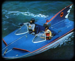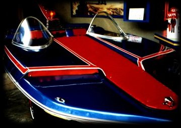 The Batboat, which was used in the BATMAN movie and a few episodes of the T.V. show was made by Glastron. The company put a fiberglass cover on and made the front look like the Batmobile. The lights on the front resemble the eyes of a bat and the fin is the tail. The windows were added to be like the Batmobiles as well. Currently the Batboat can be in the Guiness Worlds Records Musuem in Gatlinburg TN. Below are a couple of pics taken from the Musuem. It's not for sure that they are the same boat, but they look alot a like.